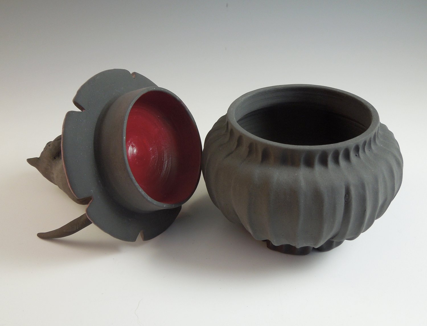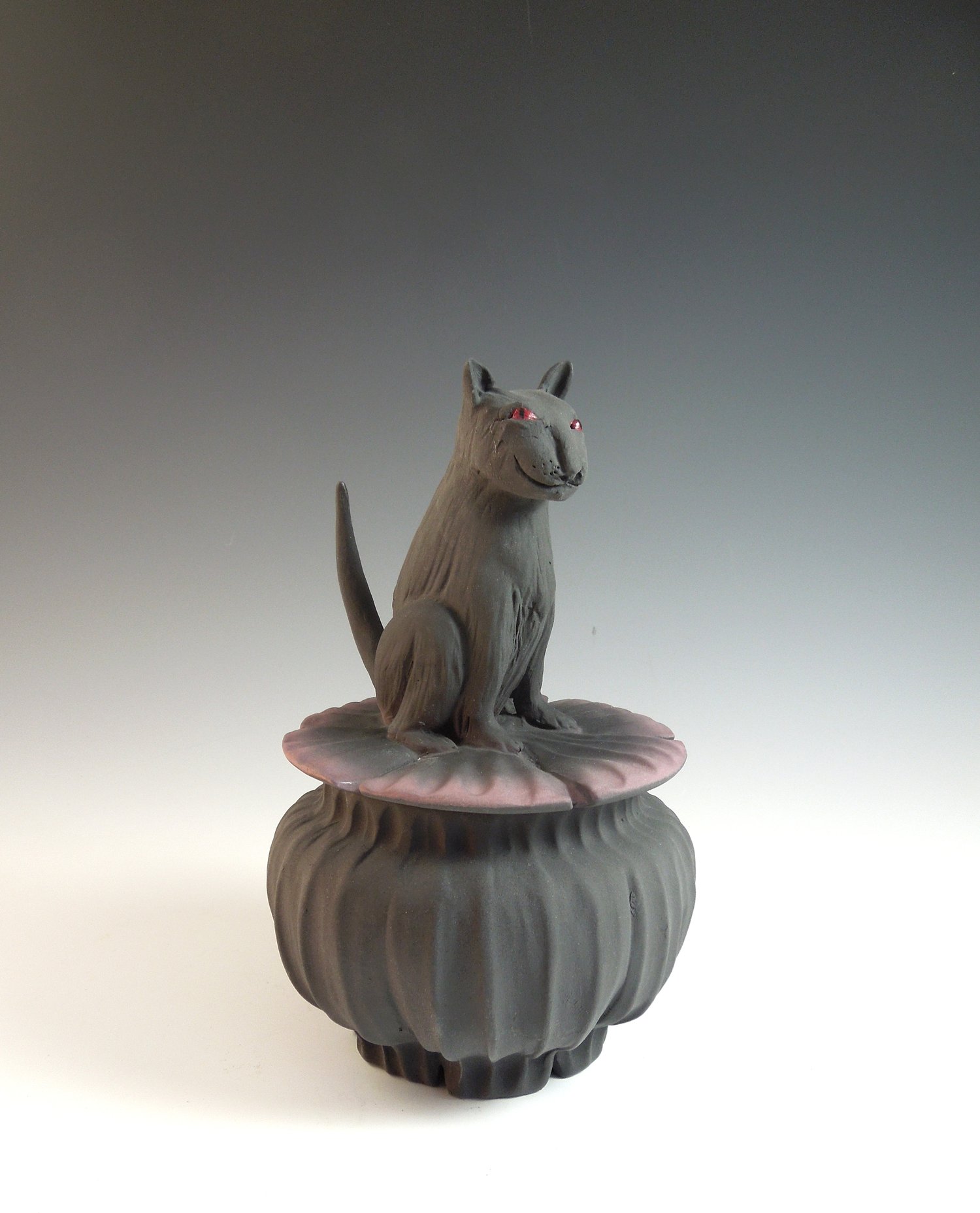 5.5"Hx4"Wx4"D Wheel thrown and hand carved box with cat sculpture. Airbrushed matte glazes fired to maturity in an oxidation kiln. Signed and dated.